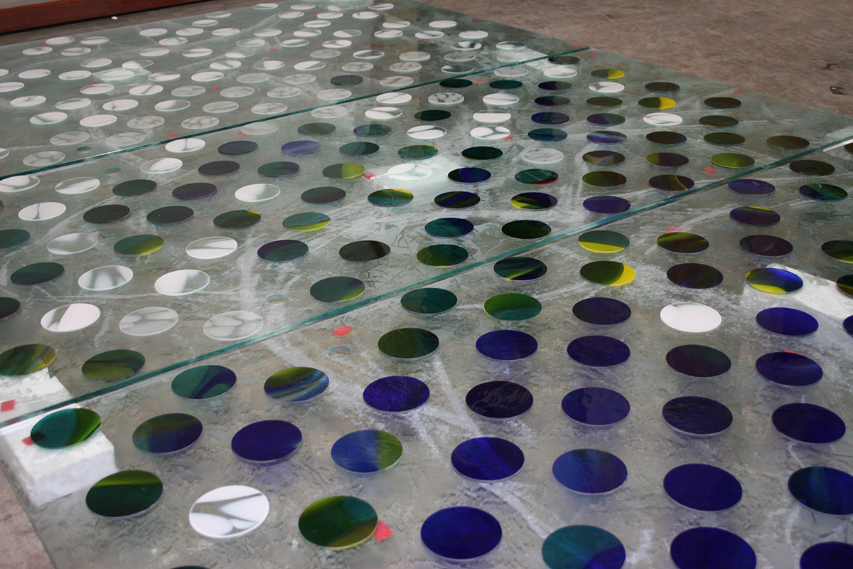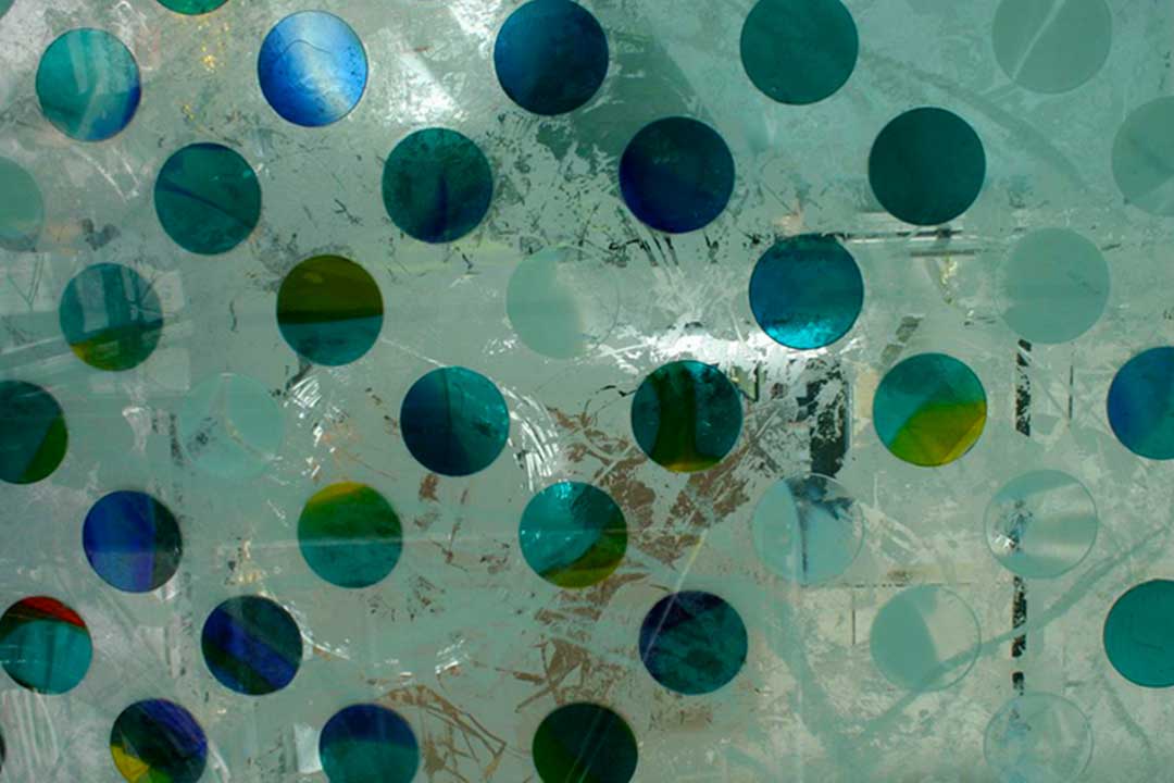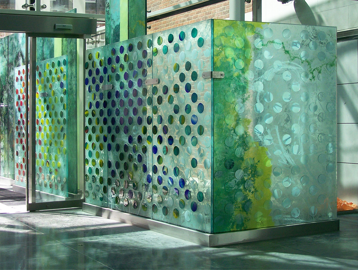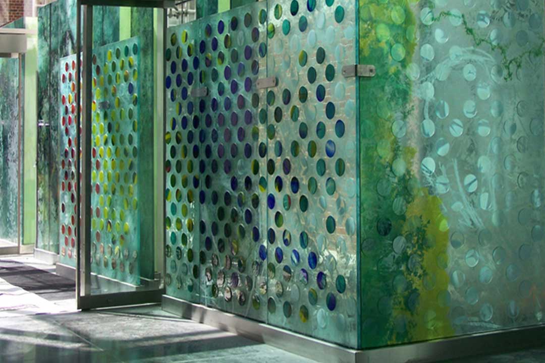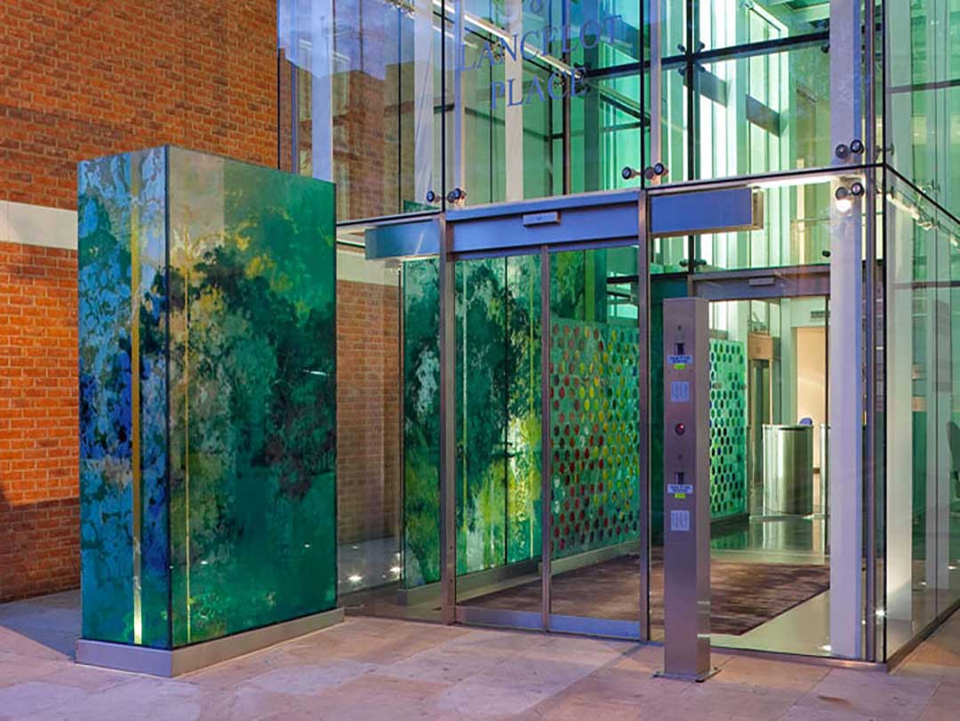 This public art project, just opposite Harrods in London, starts outside the building and traverses into the interior.  The first panel is 3m tall and entirely made with screen-printed enamels fired into the glass. This panel stands outside the building, with two glass fins supplying additional support. The small airlock area has another wall of glass, with beautiful red discs bonded to the glass, running alongside the external wall.  The glass discs are all cut from Lamberts ‘mouth-blown’ glass.  As the architectural glass artwork goes into the interior it turns around to become parallel to the external glazing – the discs shifting from red to blues and greens and finally white.